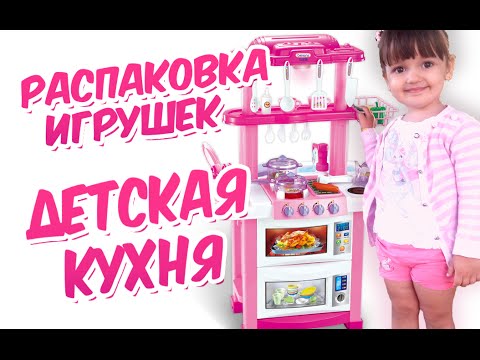 Девочка Ксюша с мамой распаковывают детский кухонный набор.